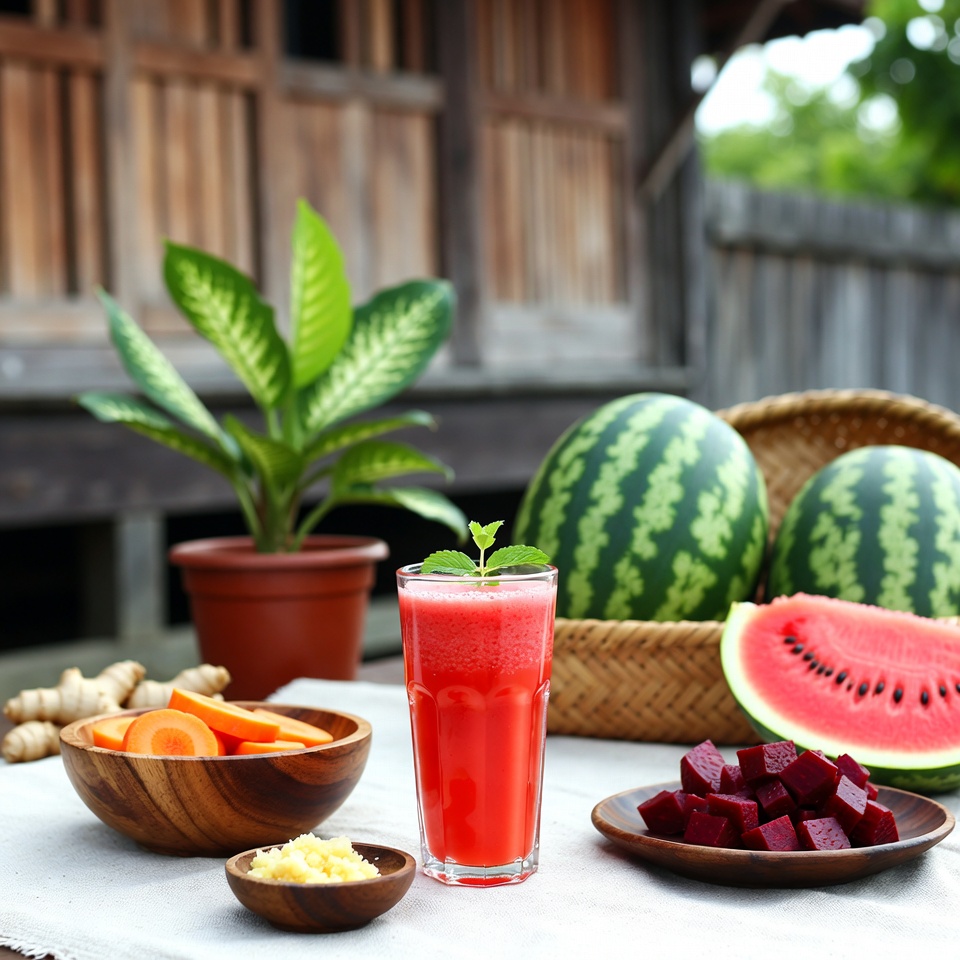 Jus semangka dengan wortel, bit, dan jahe adalah minuman alami yang lengkap, menyegarkan, dan bernutrisi. Pilihan ini sangat baik untuk menjaga tubuh tetap bugar sambil tetap menikmati rasa yang lezat dan menyenangkan. 🍉✨