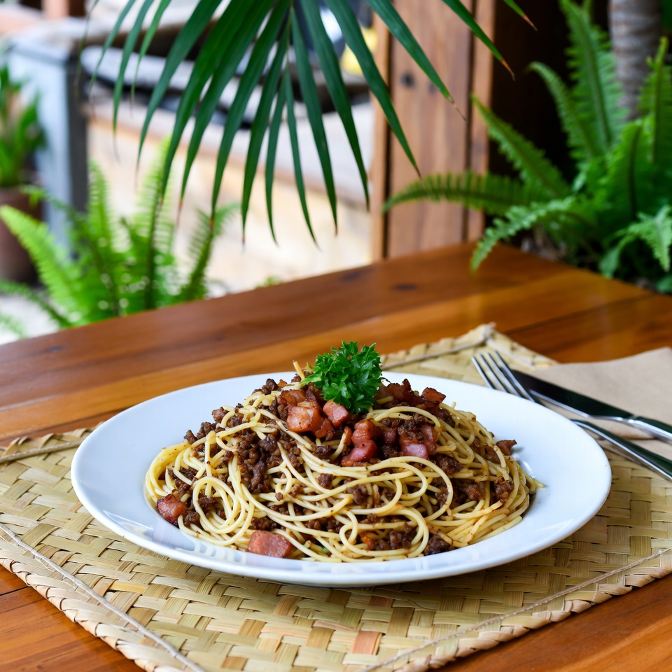 - Tuang setengah bagian saus daging di atas spaghetti, ratakan.