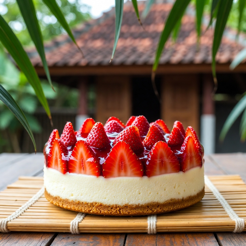 - Sebelum disajikan, taburi bagian atas cheesecake dengan stroberi cincang.