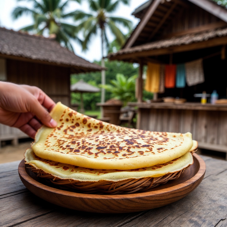 - Masak 1–2 menit sampai pinggiran crepes mulai terangkat dan bagian bawahnya berwarna keemasan.