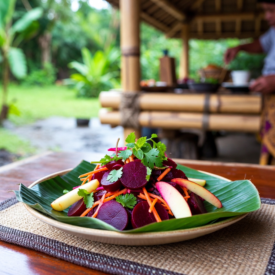Salad berwarna cerah ini bukan hanya cantik di piring, tetapi juga kaya nutrisi dan rasa. Perpaduan manis alami bit merah, kerenyahan apel, dan segarnya wortel menghasilkan hidangan yang ringan namun mengenyangkan. Jadikan salad sehat ini bagian rutin dari menu mingguan Anda.