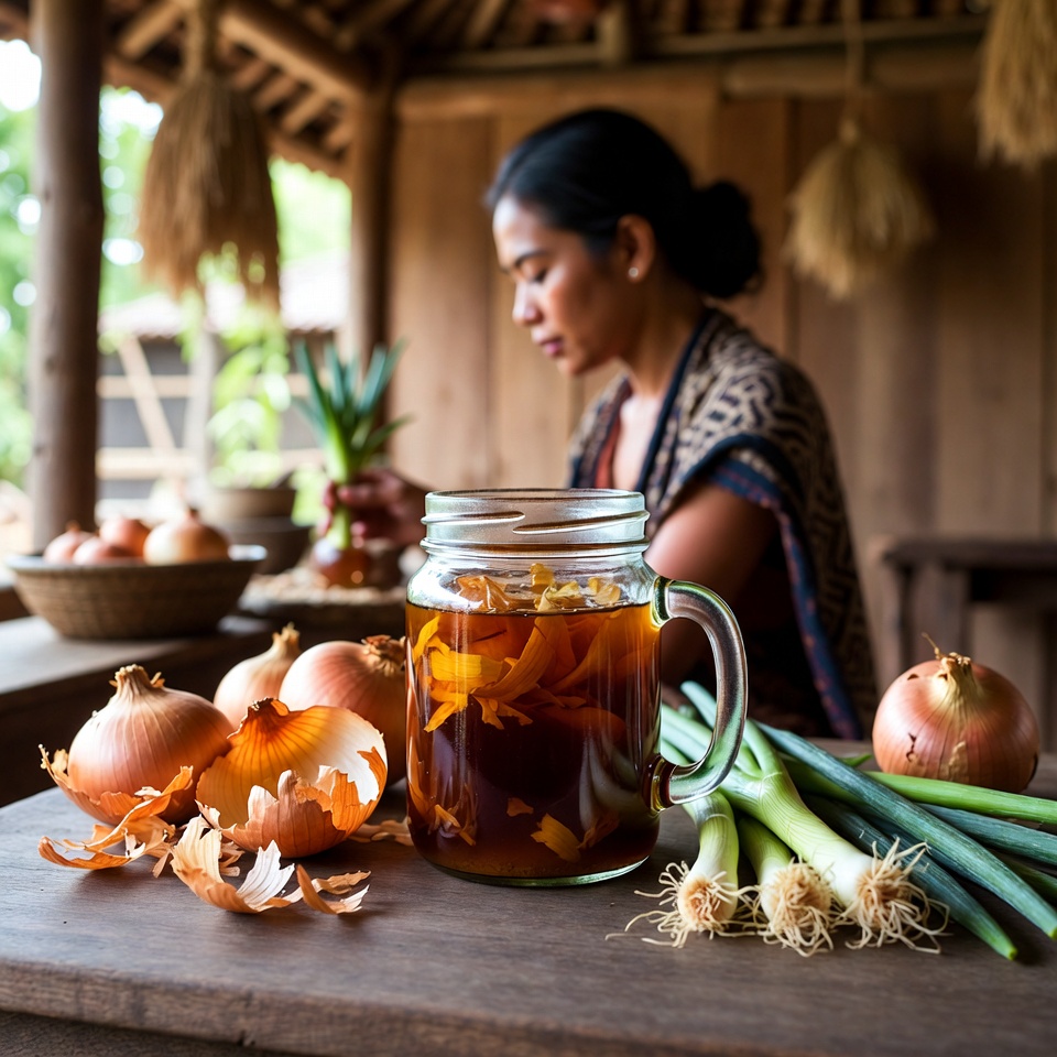 Kulit bawang yang sering kita buang ternyata menyimpan banyak manfaat untuk rambut. Kandungan antioksidan dan sulfur di dalamnya dapat membantu merangsang produksi melanin (pigmen warna rambut) sekaligus menyehatkan kulit kepala. Kombinasi ini dapat membantu mengurangi munculnya uban dan mendukung pertumbuhan rambut baru yang lebih kuat.