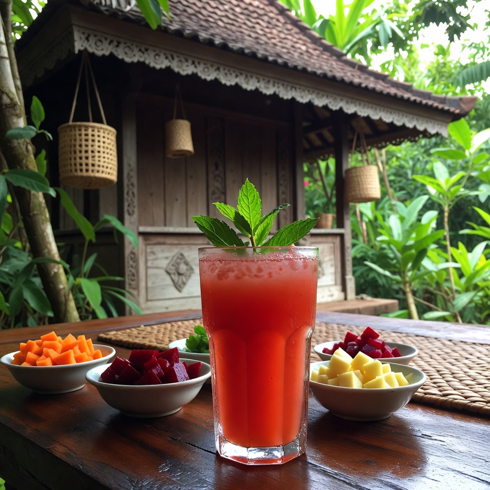 Jus semangka wortel bit jahe adalah minuman alami yang kaya vitamin dan antioksidan. Kombinasi ini membantu menyegarkan tubuh, mendukung daya tahan, serta membantu melancarkan sirkulasi darah. Rasanya segar dan nikmat—cocok diminum di pagi hari untuk memulai aktivitas dengan energi, atau setelah hari yang padat untuk memulihkan stamina.